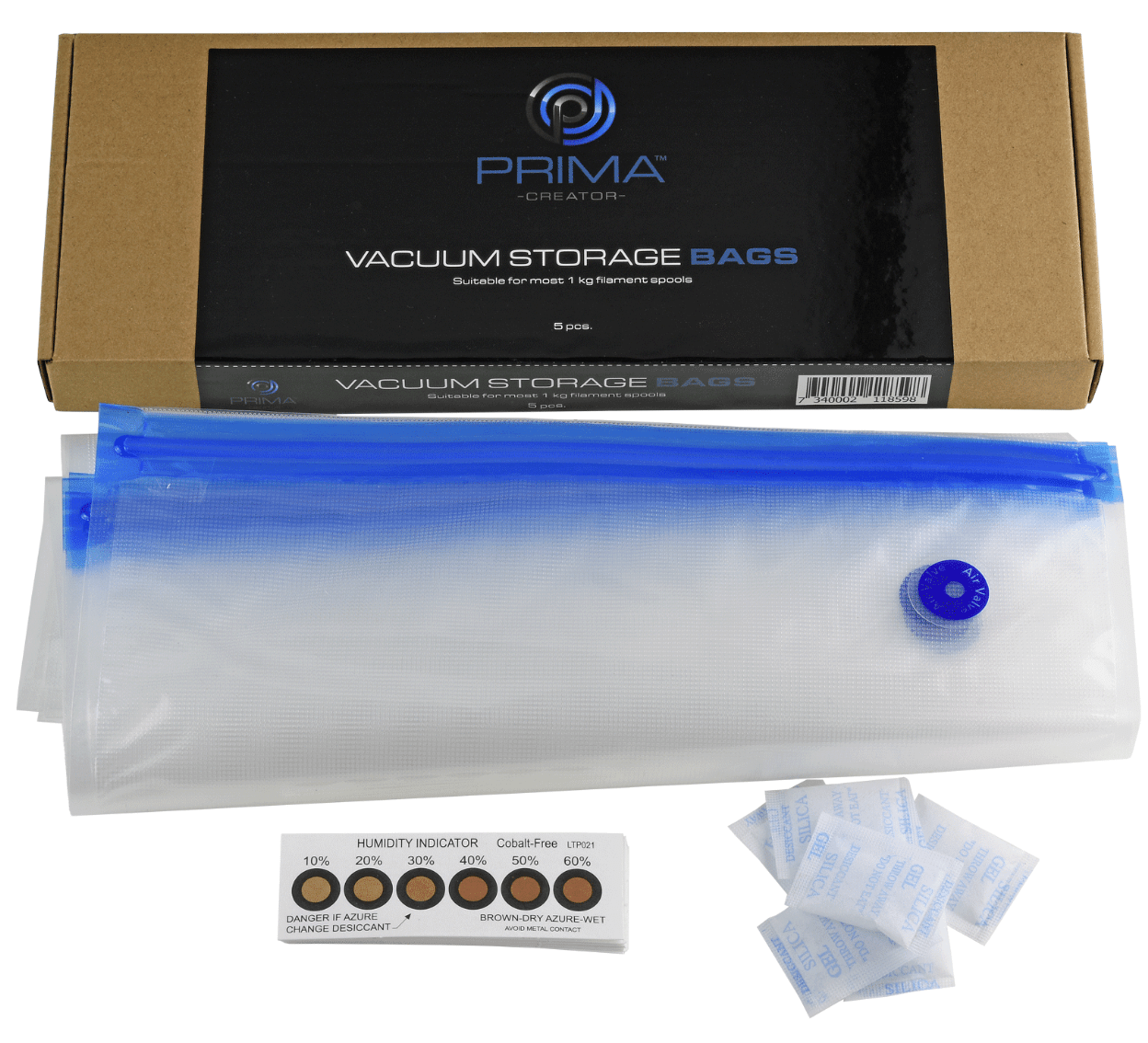 PrimaCreator Filament Storage Bags – 5-pack är den enkla och effektiva lösningen för att skydda dina 3D-filament från fukt, damm och smuts. Genom att försluta varje rulle i en vakuumpåse med medföljande fuktsensor och silikagel behåller du filamentets ursprungliga egenskaper och förlänger dess livslängd – särskilt viktigt för hygroskopiska material som nylon (PA) och PVA.